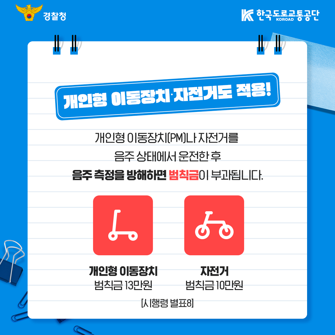 이러한 음주 측정 방해 행위를 한 경우 초범은 1년 이상 5년 이하의 징역이나 500만 원 이상 2천만 원 이하의 벌금에 처해지며※, 운전면허가 취소될 수 있다. 또한 이번 시행령 개정으로 음주 상태에서 개인형 이동장치 또는 자전거를 운전한 후 음주 측정을 방해하면 각각 13만 원, 10만 원의 범칙금을 내야 한다.